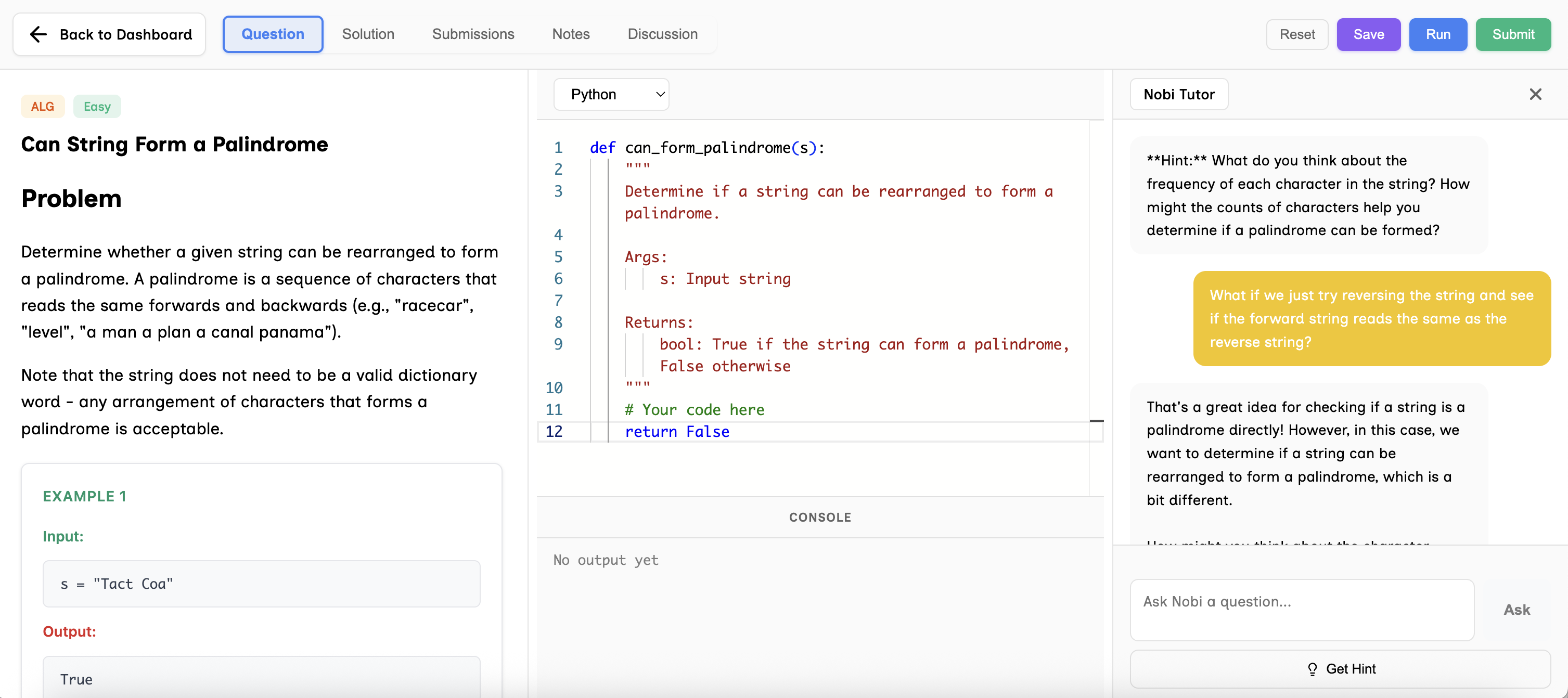Get instant hints, explanations, and answers to your questions without spoiling the solution. Nobi guides you toward the right approach while helping you understand the underlying concepts and how to communicate your thinking.